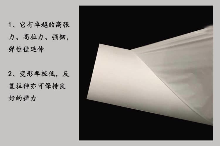1、它有卓 越的高張力、高拉力、強(qiáng)韌,彈性佳延伸